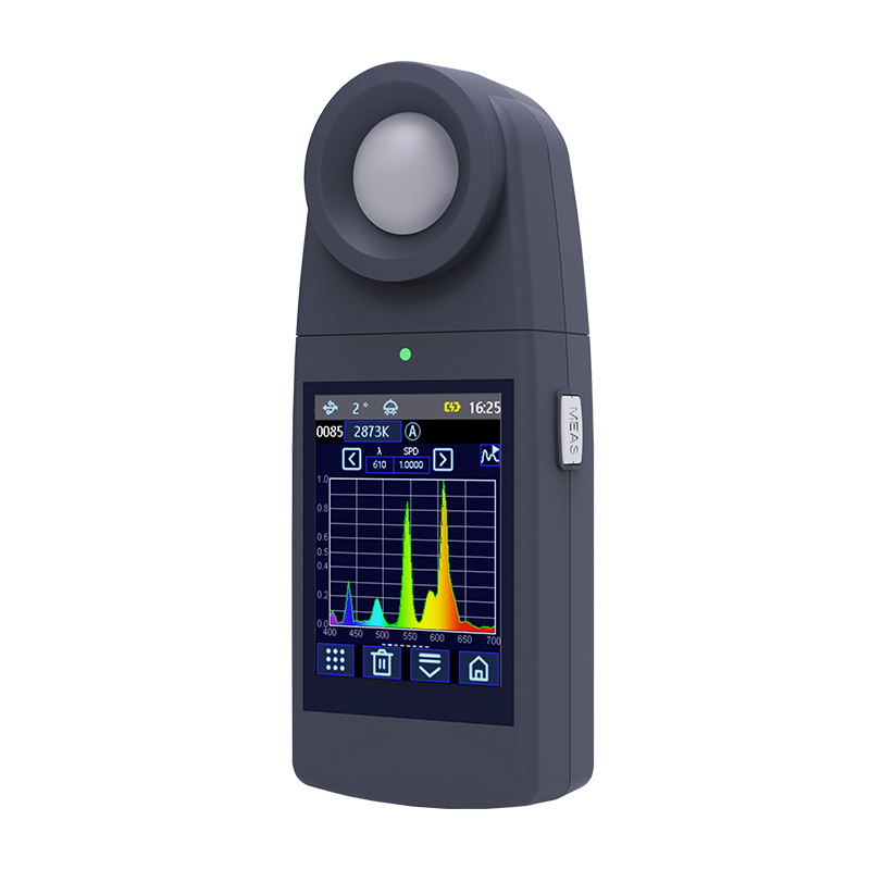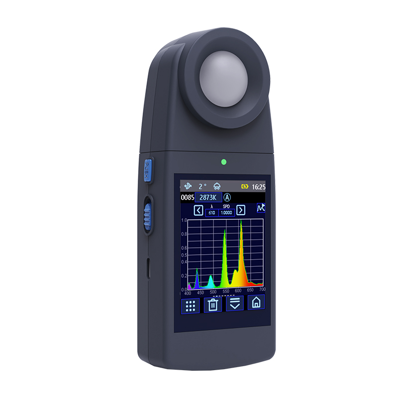 M300色彩照度计是九恩泊公司独立开发的国产便携式照度计。照度计采用多通道滤光片作为分光元器件,可采集400~700nm波长范围的光源辐射照度光谱,输出1nm间隔辐照度光谱,测量量程最高可达200000 lx。 仪器配置2.8英寸TFT电容触摸屏、4000mAh锂离子电池,蓝牙/WIFI多功能芯片,大容量存储器。 仪器不仅可以测量辐照度光谱、照度、色温、显色指数、白平衡等技术参数,还可以测量植物生长灯参数、显示器色域、均匀性、CQS、TM-30等参数,功能强大,性价比高,应用广泛。