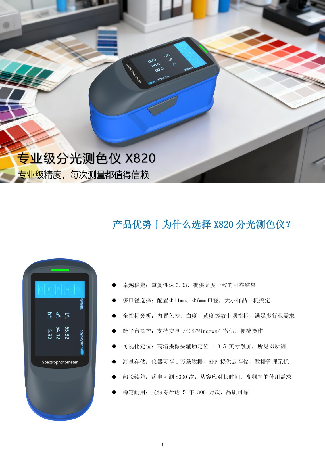 卓越稳定:重复性达0.03,提供高度一致的可靠结果 多口径选择:配置Φ11mm、Φ6mm口径,大小样品一机搞定 全指标分析:内置色差、白度、黄度等数十项指标,满足多行业需求 跨平台操控:支持安卓 /iOS/Windows/ 微信,便捷操作 可视化定位:高清摄像头辅助定位 + 3.5 英寸触屏,所见即所测 海量存储:仪器可存1万条数据,APP 提供云存储,数据管理无忧 超长续航:满电可测8000次,从容应对长时间、高频率的使用需求 稳定耐用:光源寿命达 5 年 300 万次,品质可靠