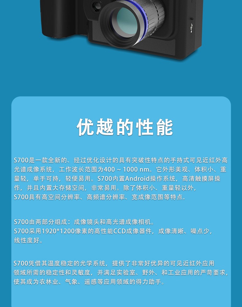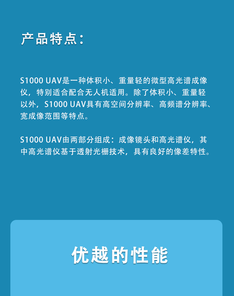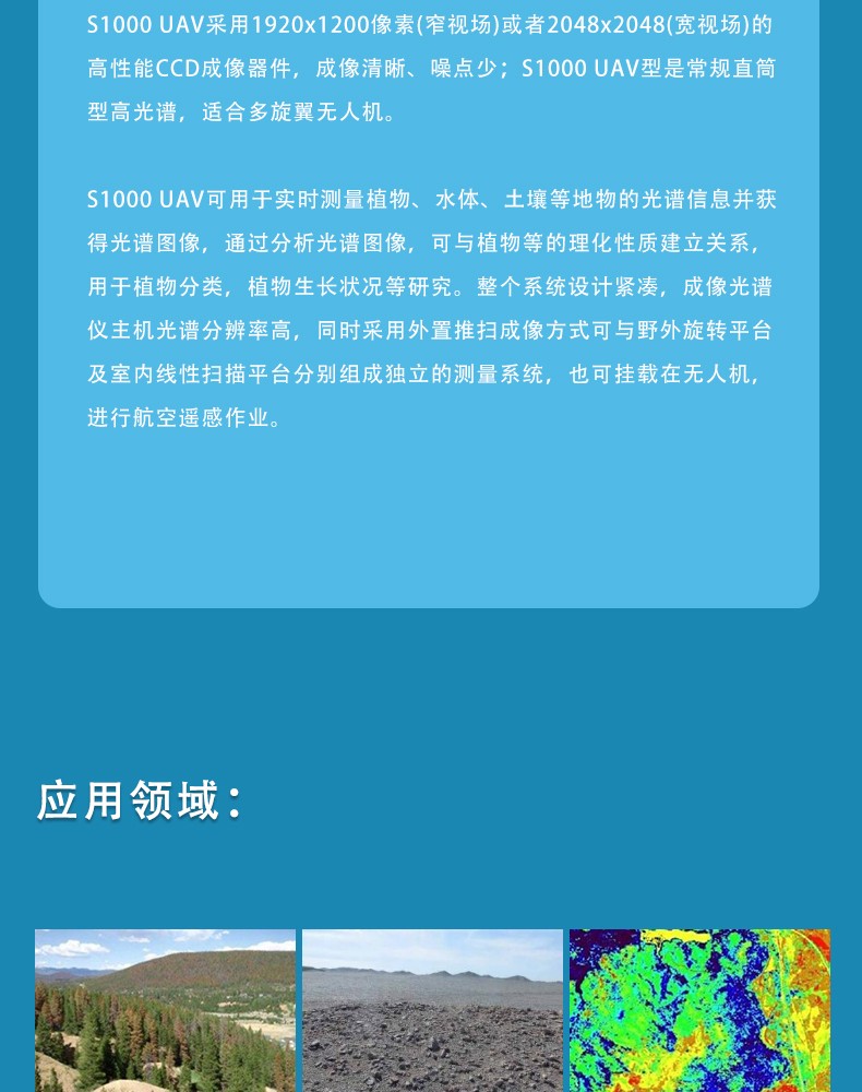 S1000 UAV 无人机高光谱相机 操作方便,无需专业无人机操控手,可实现单人操作通过地面站实时观测,飞机采样地点并可利用地面站设置逐点采集的航线数据预览及矫正功能辐射度校正、反射率校正、区域校正支持批处理,实时常用植被指数计算功能支持自定义实时分析模型输入功能. ◆操作简单 ◆逐点采集 ◆55min续航