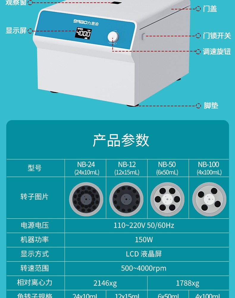NB-24 Pro 低速大容量离心机是利用离心力分离液体与固体颗粒或液体与液体的混合物中各组分的仪器。本机采用直流电机、单片机控制,具有可预设转速和时间、定时及开盖停机等多种功能,性能稳定,容量大、运行时噪音低且离心腔内温升较小。广泛适用于大中院校、石油、化工、环保等领域. ◆定时范围:0~99min59s ◆功率:150W ◆离心管最大容量:24x10mL ◆转速:500-4000rpm ◆最大离心力:2146xg ◆尺寸:390x320x270mm