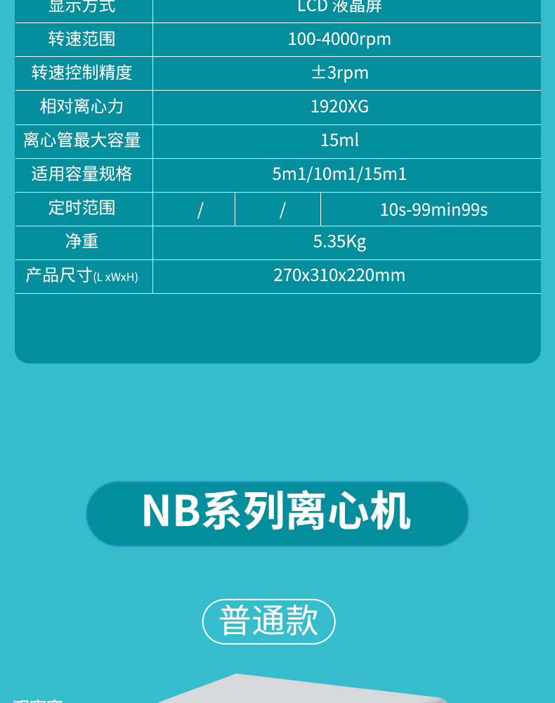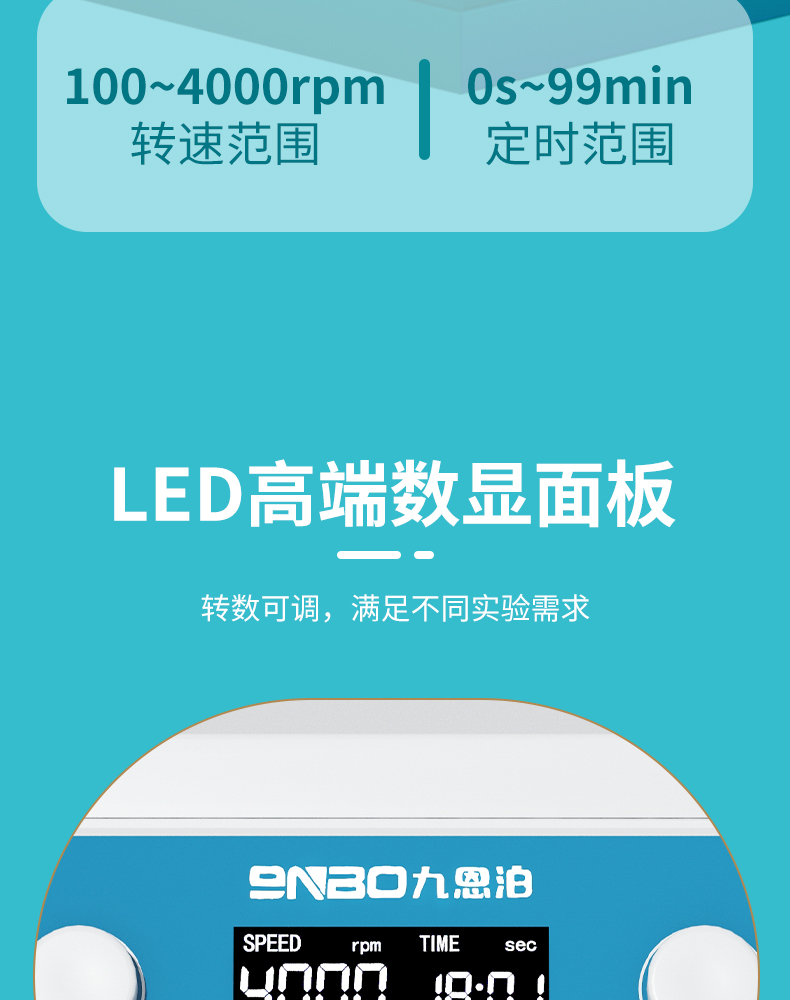 NB-100 Pro 低速大容量离心机是利用离心力分离液体与固体颗粒或液体与液体的混合物中各组分的仪器。本机采用直流电机、单片机控制,具有可预设转速和时间、定时及开盖停机等多种功能,性能稳定,容量大、运行时噪音低且离心腔内温升较小。广泛适用于大中院校、石油、化工、环保等领域. ◆定时范围:0~99min59s ◆功率:150W ◆离心管最大容量:4x100mL ◆转速:500-4000rpm ◆最大离心力:1788xg ◆尺寸:390x320x270mm